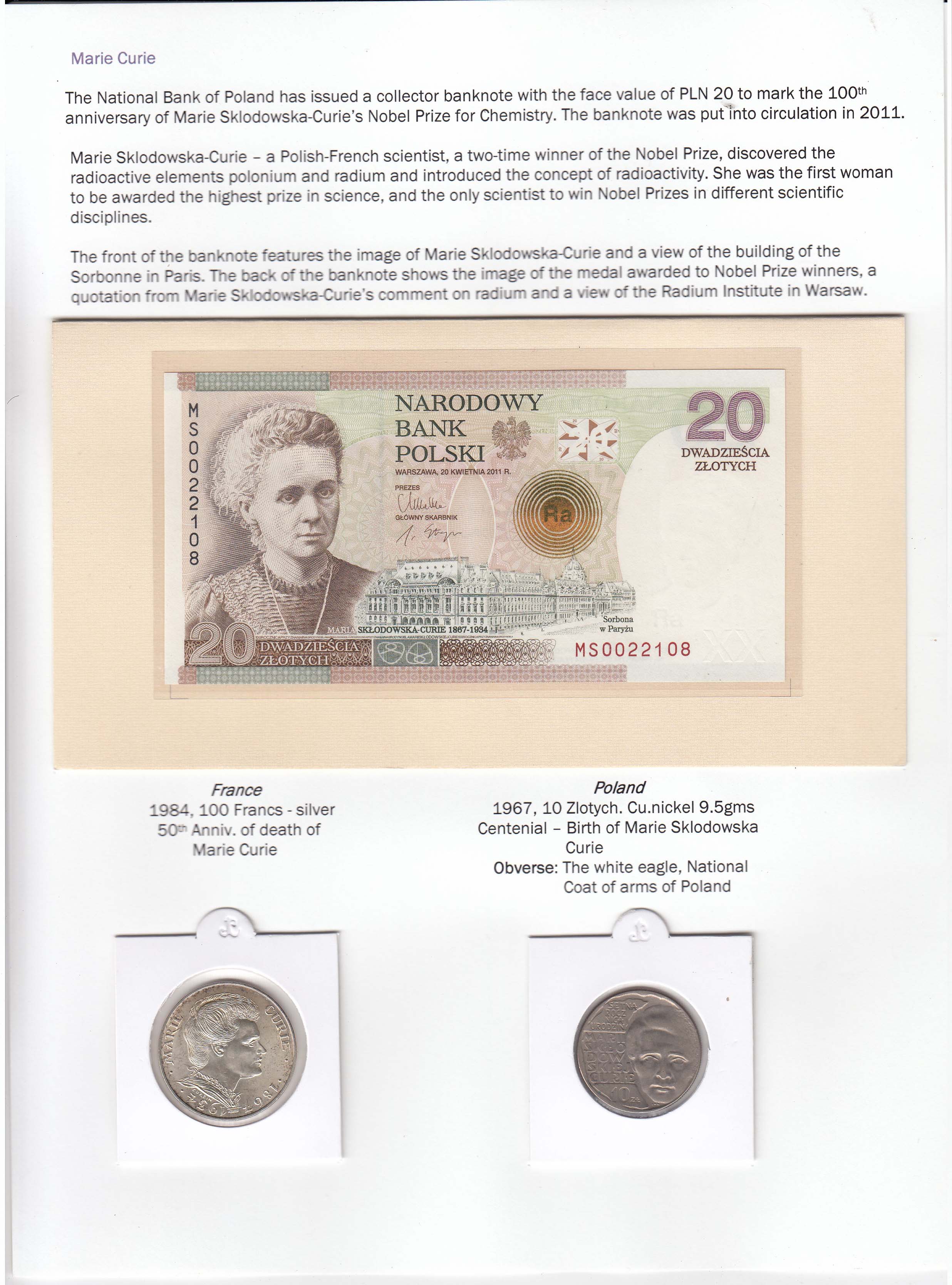 Marie Curie_Poland Banknote, France & Poland coin